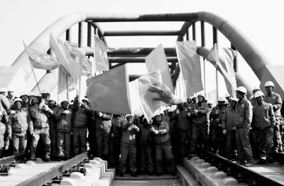 12月16日京津城际铁路全线铺通,筑路工人在开路立交桥桥头欢呼胜利。 | 12月8日,