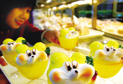 12月12日,安徽省淮南市一家蛋糕店的店员摆放可爱的生肖鼠造型甜点。农历鼠年日益临近,以生肖鼠为造型的各种糕点纷纷上柜,受到顾客喜爱。