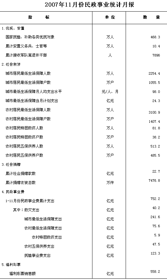 日前,民政部于其网站上公布了2007年11月份民政事业统计数据,详情如下。