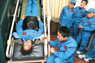 1月2日,第三届航天体验营的营员们来到中国航天科研训练中心,参加心理测试训练、“太空厨房”体验、舱内航天服装备操作体验等活动,体验太空生活。图为一名营员体验血液重新分布适应性训练。