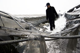 1月22日,安徽省舒城县双丰农业科技示范园的工人在整理被大雪压塌的大棚。连日来,安徽部分地区持续降雪。大雪造成全省12个市受灾,受灾人口300多万人,转移安置4000多人,因灾死亡1人,因灾伤病14人。农作物受灾面积200多万亩,倒塌房屋3600多间,直接经济损失4.3亿元。新华社记者:李健 摄