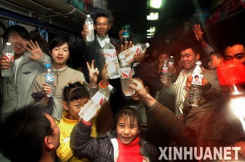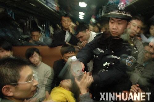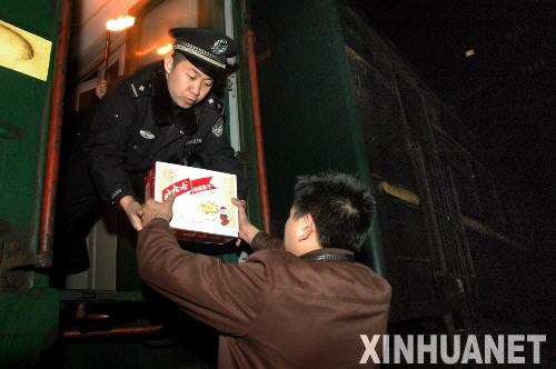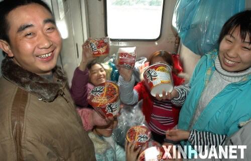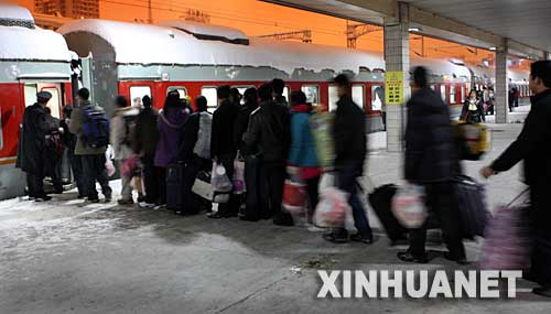 1月28日,在合肥火车站,旅客在排队上车。 当日凌晨3点,由合肥开往成都1432/1433次列车,因大雪晚点4小时后进入站台,记者随旅客队伍一起登上这趟列车,一线感受春运。开车后,各车厢列车员为旅客及时供应开水,广播员多次为列车晚点向旅客致歉,列车长和乘警走进硬座车厢检查“三品”。车厢外天寒地冻,车厢内暖意融融。新华社记者 陶明 摄