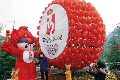 2月11日,一组由数百个红灯笼和福娃组成的大型彩灯吸引了市民的目光。春节及元宵节期间,江苏南通园艺博览园、狼山景区等地推出的多组奥运主题的花灯受到市民的欢迎。