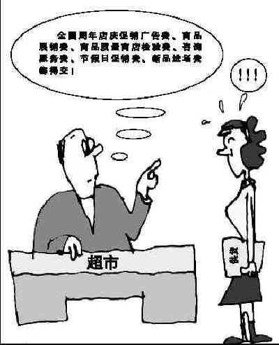 某商贸公司是一家经营了20多年的企业,与天津市所有超市都有业务往来。该企业主管让我们翻阅了部分账目和合同文本后说:“你们看看这些资料就明白了,乱收费的超市起初只有家乐福一家,现在几乎所有超市都在效仿,收费名目越来越多,真让人难以承受。” 我们随手翻阅了该公司去年和家乐福签订的一份合同,其中有如下收费条目:无条件折扣费、有条件折扣费、DM广告费、咨询服务费、共同商品服务费、节假日促销费、新品进场费、免费样品、新店开业促销费等。在与天津乐购超市签订的合同中,除上述条款外,还有全国周年店庆促销广告费、商品展销费、商品质量商店检验费等。该公司业务主管说:“这些是写在合同上的,没写的收费名目还很多,比如贡献费、价外支持费、重装赞助费等。”我们问:“这些收费合理吗?”财务人员气愤地说:“哪儿合理呀!他们收哪项费用都不敢给我们开发票,要么给虚假的购货发票,要么让用货物抵扣,不仅收了钱还逃了税。” 我们找有代表性的部分产品供货厂商座谈,大家都叫苦不迭。一个大型商贸企业的负责人说:“超市这些年做事越来越过分。沃尔玛刚进中国时,几乎不收什么费用,后来从家乐福跳槽过来一个高管,把沃尔玛也带坏了,居然做出了让我们补交往年费用的荒唐事。我们不给钱,就直接从货款里扣,真是太霸道了!”