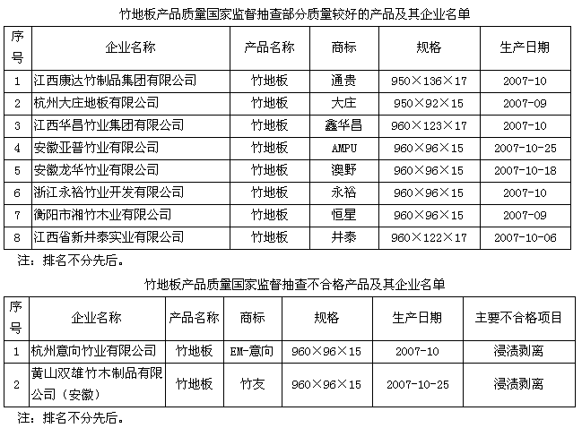 抽查中反映出的主要质量问题是个别产品浸渍剥离项目达不到标准规定的要求。浸渍剥离试验是产品经浸水、烘干后考核竹地板产品的胶合性能,若浸渍剥离试验达不到标准规定的要求,竹地板易产生脱胶现象,从而影响竹地板的质量。