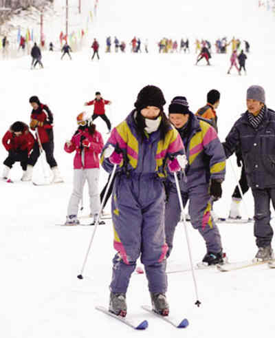 | 正在学习滑雪的南方游客 | 当滑雪从欧美传入中国后,谁也不曾想到,这项西方的“贵族运动”会在近几年,在中国迅速走向大众。几年突飞猛进地发展,使滑雪运动不再高高在上。在一些滑雪场可以看到,当地地地道道的农民担当着导滑员,操练着城里人,发烧友不再只是那些
