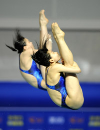 3月23日,郭晶晶(右)吴敏霞在安徽合肥举行的2008年全国跳水冠军赛暨奥运会选拔赛(双人)女子双人3米板决赛中,以348.00分的成绩夺得金牌。新华社记者:李健 摄