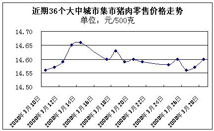据国家发展改革委价格监测中心监测,上周(2008.3.24-2008.3.28,下同)全国36个大中城市集市猪肉(精瘦肉)平均零售价格每500克为14.58元,比前一周(2008.3.17-2008.3.21,下同)下降0.14%。