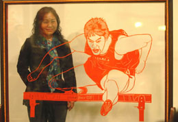 “中国人的骄傲”剪纸艺术巡展首站在香港中央图书馆启动,展出近200幅以奥运为主题的剪纸作品。图为“中国人的骄傲——永恒瞬间”创作人卢雪和她的作品《刘翔》合影。 |