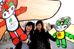 两位姑娘在汉中市桥北广场选购制作精美的福娃风筝。