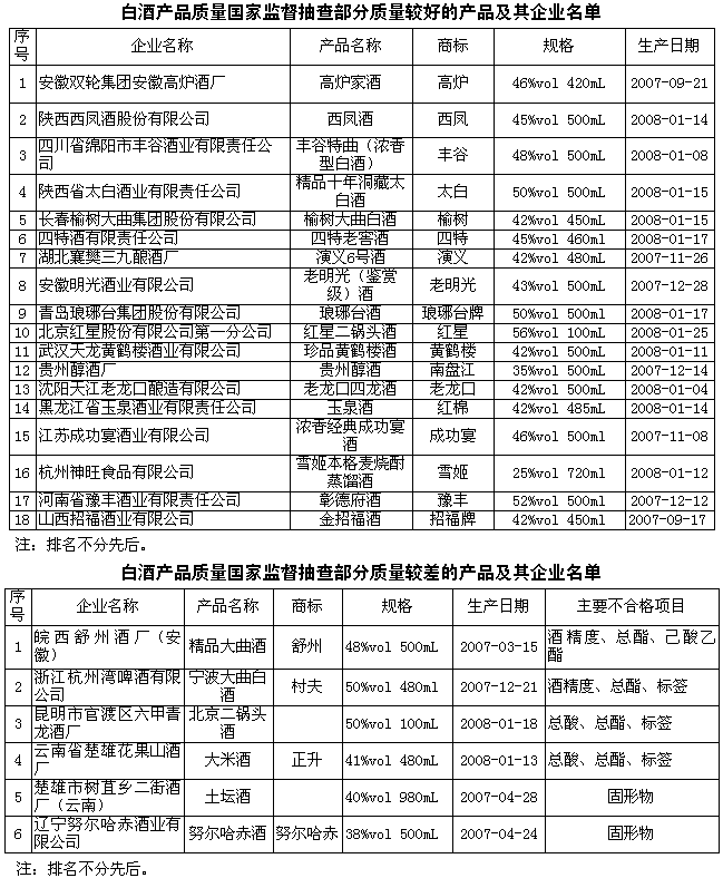 此次抽查依据GB2757-1981《蒸馏酒及配制酒卫生标准》、GB10344《饮料酒标签标准》、GB7718-2004《预包装食品标签通则》、GB2760-1996《食品添加剂使用卫生标准》等国家标准及相关产品标准规定的要求,对白酒产品的感官指标(色、香、味、格)、理化指标(酒精度、总酸、总酯、己酸乙酯、乙酸乙酯、固形物、糖精钠)、卫生指标(甲醇、铅)以及标签等14个项目进行了检验。经检验,白酒产品的卫生指标全部符合国家相关标准规定的要求。