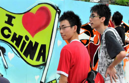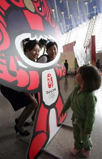 5月1日,青少年在塔石广场上观看迎接北京奥运会的“创意涂鸦大比拼”作品。当日,中国澳门特区在塔石广场举办“中国澳门青年喜迎2008北京奥运”活动,逾万名中学生及当地居民参与到活动当中。