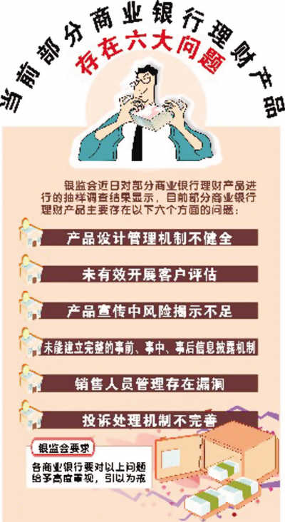 银监会对部分银行理财产品进行了抽样调查,发现部分银行在开展理财业务的过程中存在较为严重的违规行为;核心是未严格且有效执行相关法律法规和监管规章。“部分商业银行未能按照符合客户利益和风险承受能力的适应性原则设计理财产品,没有从资产配置的角度进行产品开发和投资组合设计,没有应用科学合理的测算方法预测理财投资组合的收益率,没有设置相应的市场风险监测指标和有效的市场风险识别、计量、监测和控制体系。” “产品设计管理机制不健全”是部分银行个人理财产品的“第一宗罪”。同时,部分商业银行在代理销售其他金融机构投资产品过程中,没有对所代理产品进行充分分析,对产品提供者经营管理、市场投资和风险管理能力没有进行有效评估,没有明确界定双方权利义务和风险责任,对代理销售产品的风险收益监测数据没有进行必要验证。 其后是“未有效开展客户评估”。部分商业银行没有进行客户风险偏好评估工作,或评估工作流于形式;没做到准确了解客户的财务状况、投资目的、投资经验以及风险认知和承受能力;没有评估客户是否适合购买所推介的理财产品,并将有关评估意见告知客户。 同时“产品宣传中风险揭示不足”。部分商业银行“未能建立完整的事前、事中、事后信息披露机制”;未及时通过有效渠道和方式向客户告知相关情况,特别是在理财产品存续期内,未能很好地向客户提供方便、及时、准确的资产变动、期末资产估值等重要信息。 此外,部分商业银行对理财产品销售人员的管理存在漏洞;而且投诉处理机制不完善。主要表现为部分商业银行没有对本行理财产品销售人员进行有效管理,没有建立相应的个人理财业务人员资格考核与认定、继续培训、跟踪评价等管理制度。缺乏专门的人员和部门及时处理客户投诉,客户投诉情况分析研究不足,对于客户投诉较多的理财业务环节和理财产品不能及时有效地解决和改正。