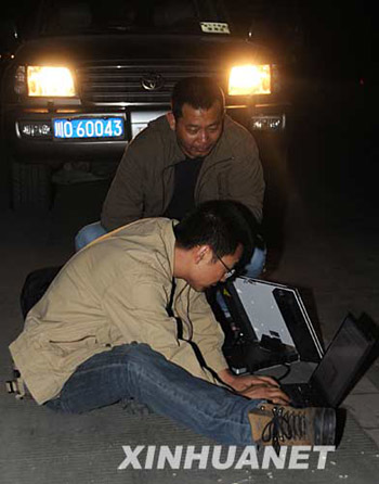 5月13日凌晨,新华社记者陈燮在前往北川县城的途中遇阻后,不顾两边山体轰隆隆垮塌,冷静地在公路上借助车灯,用海事卫星向总社发稿。