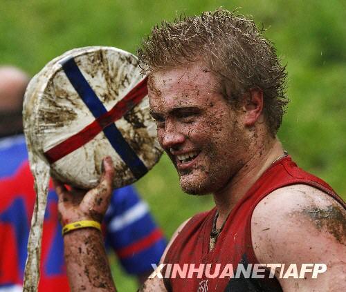 5月26日,在英国格洛斯特郡库珀山举行的滚奶酪比赛上,满身泥泞的获胜者展示追到的奶酪。新华社/法新