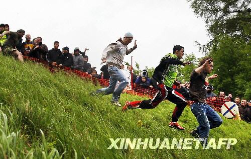 5月26日,在英国格洛斯特郡库珀山举行的滚奶酪比赛上,参赛者奔跑追逐从山坡上滚下的巨型奶酪,最先追到者获胜。一年一度的滚奶酪比赛是英国格洛斯特郡的一项传统赛事,至今已有200多年历史,但由于山坡陡峭光滑,比赛中常有人受伤。 新华社/法新