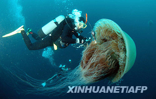 这张2006年10月4日拍摄的照片显示,在日本北部石川县小松海边,一位潜水员在一只水母身上系上传感器。新华社/法新