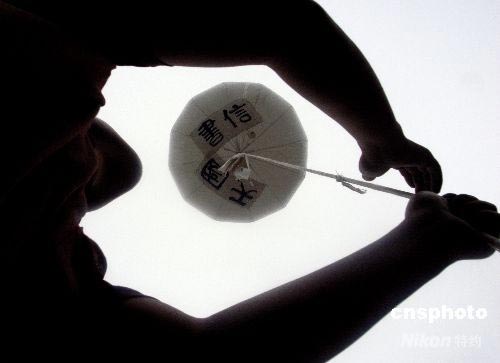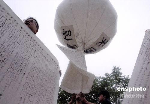 6月29日下午2点28分,北京艺术家朱永灵在北京798艺术区为四川地震遇难者放飞“天国书信”。这些书信摘抄自汶川大地震纪念馆网站上网民为地震遇难者所写的留言。