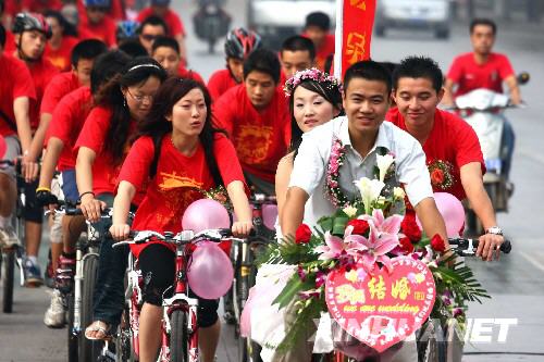 6月29日,安徽芜湖市一对新人举行别开生面的自行车婚礼,新郎骑着自行车迎娶新娘,200多名自行车爱好者组成的迎亲队伍随行,场面壮观。