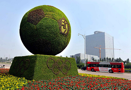 [进入北京奥运会专题] 沈阳奥体中心附近的一条街道上,矗立着一个以足球为造型的花卉雕塑。随着奥运会开幕日期临近,在北京奥运会分赛场之一的沈阳市,无论是城区还是旅游景点,到处都能感受到浓郁的奥运氛围。