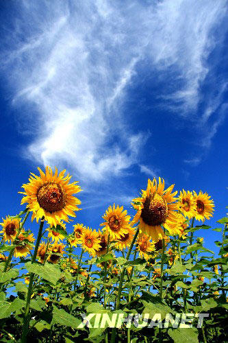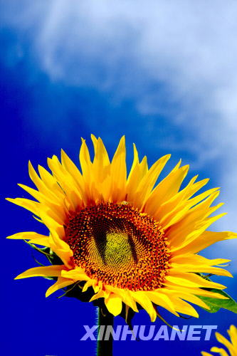 7月22日在新疆阿勒泰拍摄的盛开的向日葵。7月中旬以来,阿勒泰市周边的10万亩向日葵竞相绽放,景色迷人,吸引了大量游客前来观赏,也吸引了许多养蜂人前来放蜂、采蜜。