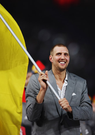 8月8日晚8时,第29届夏季奥林匹克运动会在国家体育场——“鸟巢”隆重开幕。这是德国代表团旗手诺维茨基在开幕式上入场。