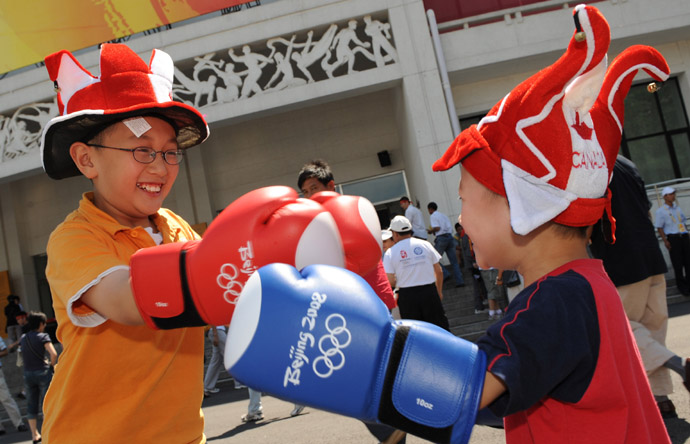 8月15日,两个即将观看北京奥运会拳击比赛的小朋友,在拳击比赛场馆——工人体育馆外戴着拳套玩耍。