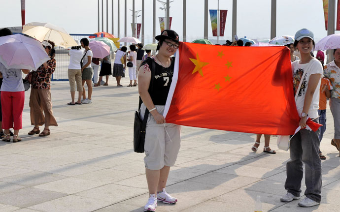 8月15日,两位青岛市民打出五星红旗为中国运动员加油。