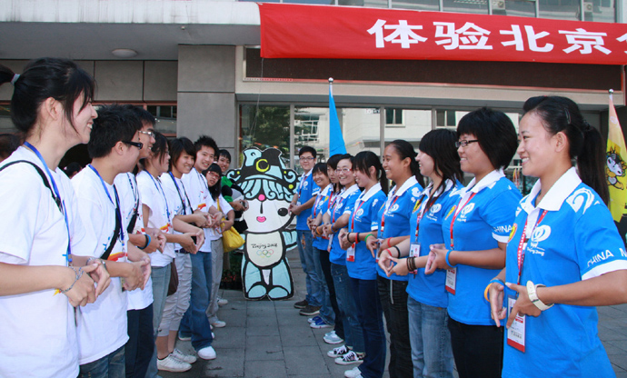 8月15日,北京西城区奥运会城市志愿者和台湾青少年开展奥运会志愿服务交流活动。当日,“相约2008—第九届京台青少年交流周暨两岸青年同心结奥运体验营”开幕式在北京西城区举行,来自台湾的近400名学生参加活动。