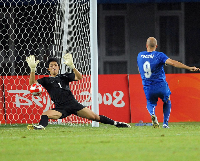8月10日,韩国队守门员郑胜龙(左)未能扑救出意大利队球员托马索·罗基的进球。当日,在秦皇岛市奥体中心体育场举行的奥运会男子小组赛D组比赛中,意大利队以3比0战胜韩国队。