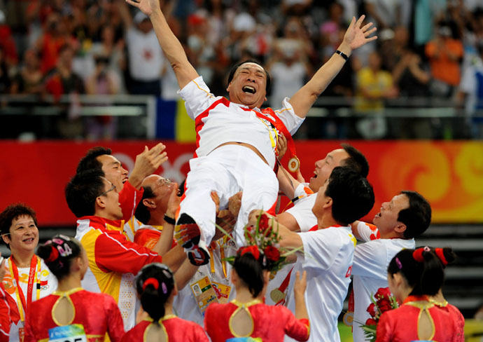 8月13日,中国队在国家体育馆创造历史。中国队在北京奥运会体操女子团体决赛中以188.900分的成绩夺得冠军。这是赛后队员为主教练陆善真(上)戴上金牌,然后将他抛起庆祝胜利。