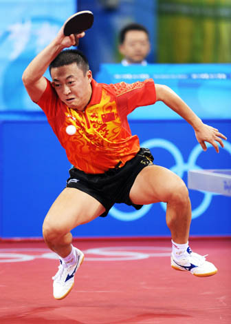 8月16日,中国选手马琳在比赛中。当日,中国队在北京奥运会乒乓球男团半决赛中以3比0战胜韩国队,挺进决赛,将于18日与德国队争夺金牌。