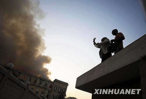 8月19日,两名埃及记者爬到高处观察埃及议会上议院大楼失火情况。当日,埃及议会上议院大楼发生火灾,楼内冒出滚滚浓烟。据埃及电视台报道,火灾目前已造成至少13人受伤。