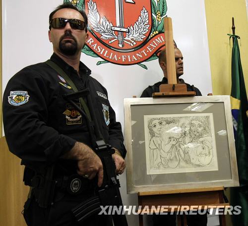 8月18日,巴西警察在巴西圣保罗向人们展示失而复得的毕加索画作《弥诺陶洛斯、酒鬼和女人》。《弥诺陶洛斯、酒鬼和女人》于6月12日在巴西圣保罗一家画廊被人偷走,当时失窃的还有其它三幅名画。新华社/路透