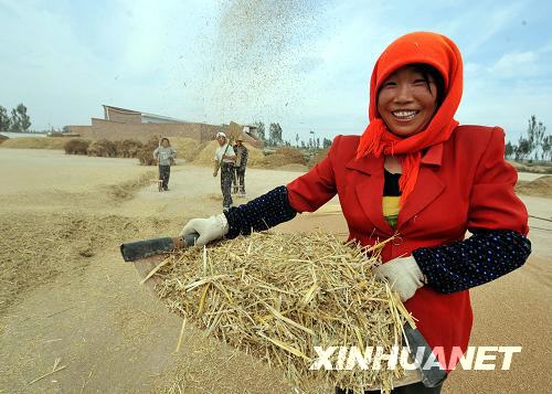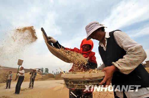 8月19日,甘肃省永登县上川镇沙梁墩村农民在麦场上劳作。甘肃省通过大力增加农业投入、推广农业新技术等手段,努力稳定和增加粮食生产,今年上半年全省夏粮再获丰收,预计夏粮总产量346万吨,比去年同期增加9.23% 。