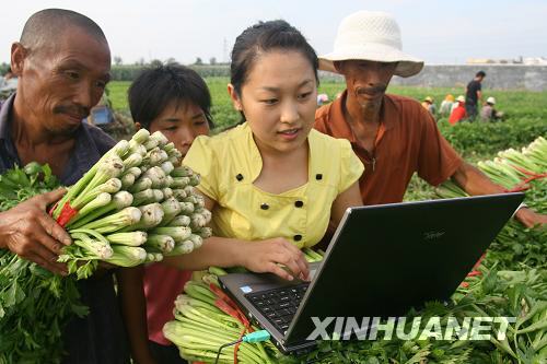 8月20日,山东博兴县博昌街道办西谷王村村委会的刘敏(中)通过网络视频帮助农民销售西芹。日前,博兴县博昌街道办发展种植的1万多亩无公害西芹已陆续上市。当地村委会帮助农民通过网络视频在田间地头直接与外地客户接触,洽谈蔬菜购销,吸引了来自全国各地的客商。