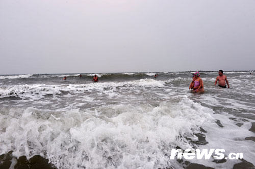 8月31日,辽宁省葫芦岛市洪家海湾,游人在海水中玩耍。
