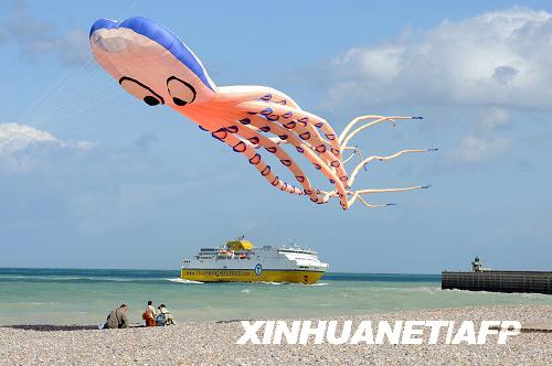 9月6日,在法国北部迪耶普举行的第15届国际风筝节上,一个章鱼形风筝升空。今年的风筝节吸引了来自38个不同国家和地区的爱好者参加。新华社/法新
