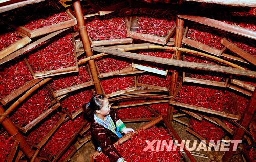 9月24日,在广西融水苗族自治县杆洞乡花孖苗寨,寨里辣椒合作社的一位社员在辣椒烤房里准备烘烤辣椒。