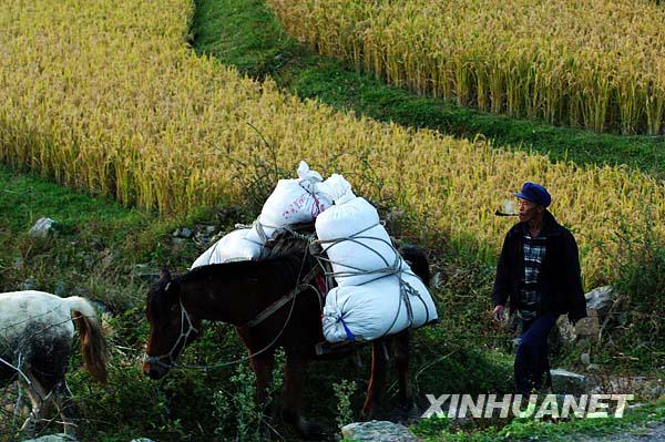 10月7日,贵阳市花溪区高坡乡大洪村农民运送刚收割的稻谷回家。眼下贵阳已进入秋粮收割高峰期,农民们正利用好天气加紧抢收稻谷,颗粒归仓。