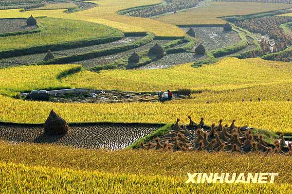 10月7日在贵阳市花溪区高坡乡拍摄的稻田。眼下贵阳已进入秋粮收割高峰期,农民们正利用好天气加紧抢收稻谷,颗粒归仓。
