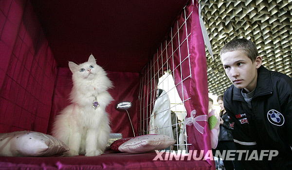 10月12日,在吉尔吉斯斯坦首都比什凯克,一名男孩观看猫展上展出的猫。新华社/法新