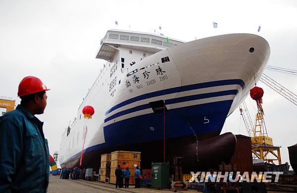 10月30日,大型豪华客滚船“渤海珍珠”轮在山东黄海造船厂顺利下水。