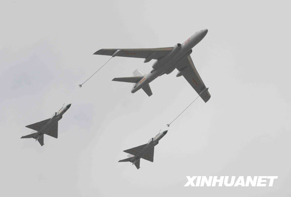 11月5日,一架轰油6和两架歼8D飞机表演空中加油。 当日,第七届中国国际航空航天博览会进入第二天,“中国航空日”的各项飞行表演和展览精彩纷呈。本届珠海航展将于本月9日结束。