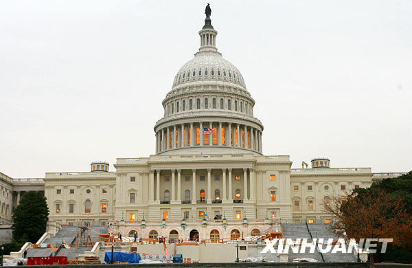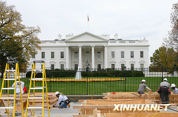 11月5日,在美国首都华盛顿,建筑工人在白宫北门搭建观礼台。已当选下届美国总统的奥巴马2009年1月在国会宣誓就职后,将在这里举行庆祝仪式。白宫、国会等处目前正在进行新总统就职典礼的搭台施工,准备迎接奥巴马宣誓就职。