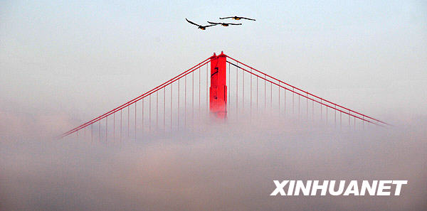 11月18日,在美国加利福尼亚州旧金山,笼罩在晨雾中的金门大桥看起来如同海市蜃楼般迷幻。金门大桥于1937年建成,两个主桥墩之间的距离为1280米,是旧金山最著名的标志性建筑。