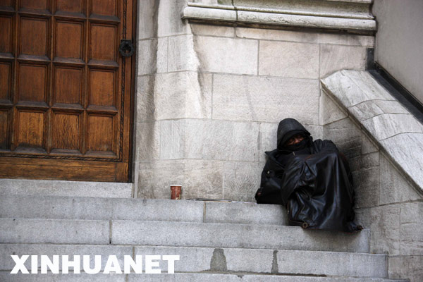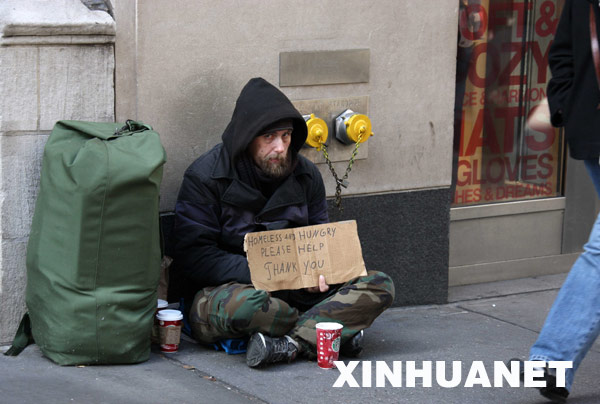 12月5日,美国劳工部公布的数据显示,今年11月份美国非农业部门就业岗位减少53.3万个,为1974年12月份以来的最大减幅,失业率上升到6.7%,为15年来的最高点。这是11月11日,一名流浪汉在美国纽约曼哈顿街头乞讨。