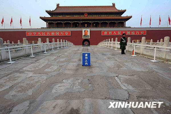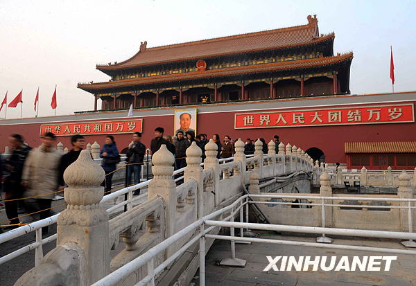 天安门金水桥(12月9日摄)。据北京市文物局9日透露,为迎接2009年国庆60周年,确保游客和文物安全,北京市文物局已于近日启动了天安门金水桥加固修缮工程,整个工程预计将于2009年5月完工。天安门金水桥是整个天安门景观的重要组成部分,因游客众多以及风化等自然因素,天安门金水桥桥面此前多处出现破损,栏杆部分也出现裂缝,存在一定的安全隐患。