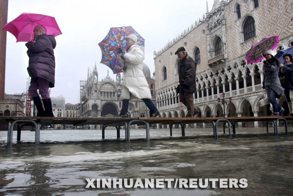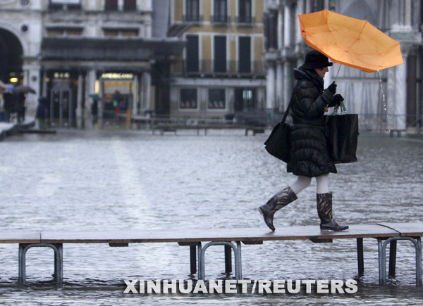 12月10日,在意大利“水城”威尼斯,一名行人使用临时搭建的通道穿过被洪水淹没的广场。 威尼斯本月遭受20年未见的大洪水侵袭,全城98%陆地被淹没。为挽救旅游市场,威尼斯旅馆业推出“威尼斯高水位”旅游促销计划,把洪水包装成旅游卖点,为游客免费提供橡胶长靴、高水位步行路线图及住宿费打折等服务。 新华社/路透