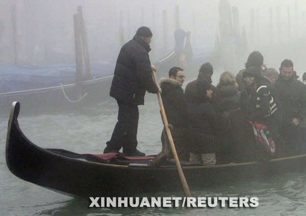 12月10日,在意大利“水城”威尼斯,人们在浓雾中乘船游览。 新华社/路透